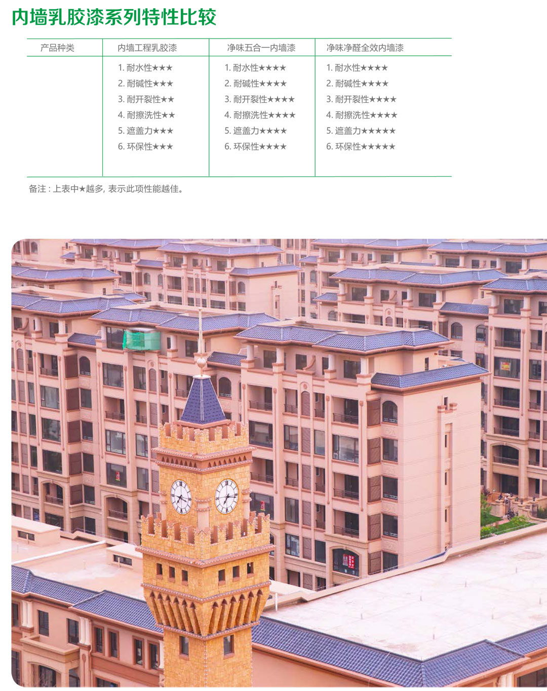 采用特別研發(fā)配方的健康環(huán)保型內(nèi)墻乳膠漆,該產(chǎn)品易施工,耐臟易擦,防霉抗菌,適用于大眾建筑的內(nèi)墻及各種柱、欄桿等裝飾造型,該產(chǎn)品健康環(huán)保,其揮發(fā)性有機(jī)化合物 VOC 含量遠(yuǎn)低于國家頒布的相關(guān)標(biāo)準(zhǔn)。